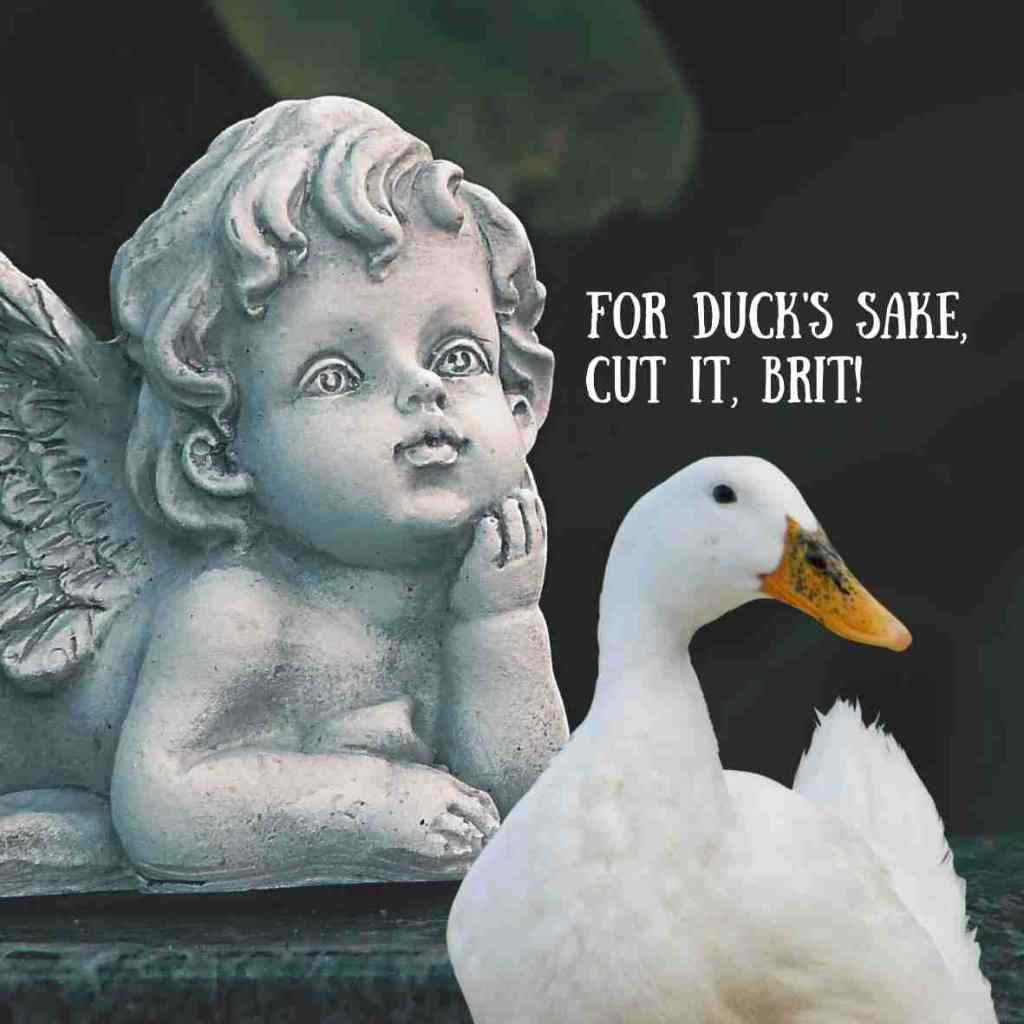 Friends, long ago, in the dark days when I was just a youthful thing, I lived over in Blighty and used words like “cuppa,” “bleeding heck,” and “cor blimey—sometimes all at the same time, depending on how strong the tea was. But now, my plush duck, name of Duck—who is also British, I might add—often decides to censor my Englishness. For ri-duck-ulous reasons.