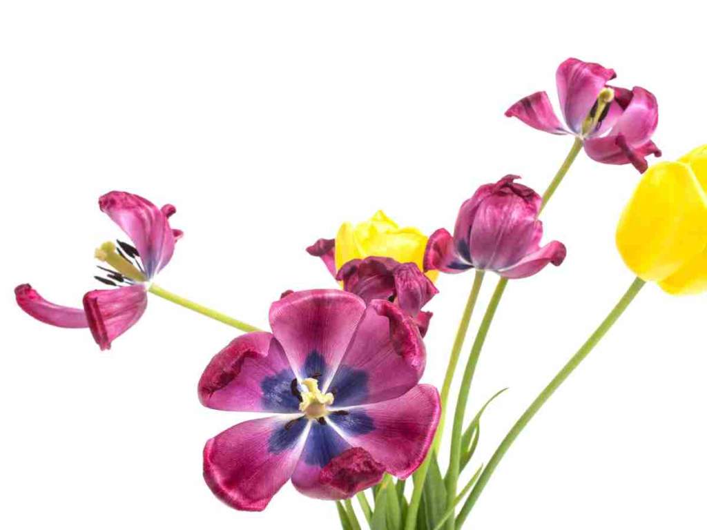 Great point, as always. Anyway, when I was a kid, I loved tulips until they started to wilt. You know how they get when the petals tumble open and the stamen inside pokes out like a spiked, angry insect? In case you don’t, here’s a pic, with thanks to Canva. The tulip on the far left is exactly what I’m talking about. How is that not LOOKING TO BITE MY NOSE OFF?